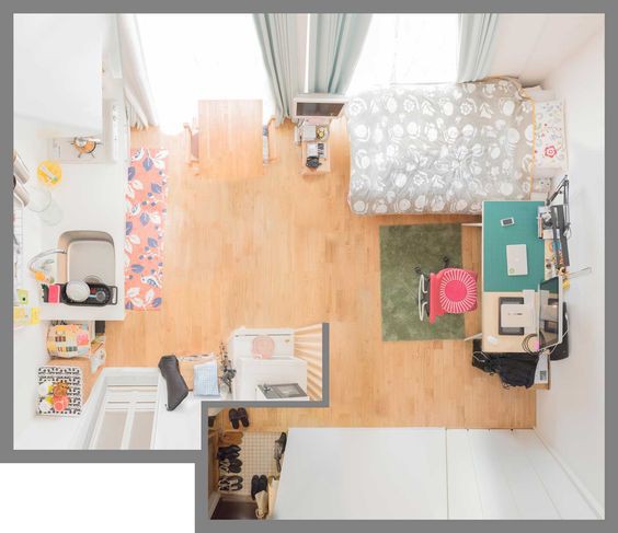 Phòng ngủ được đặt gần khu vệ sinh, phòng khách và khu vực nấu ăn được đặt trong một