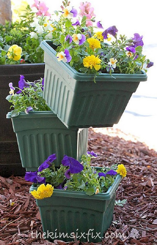 Hãy xếp chồng các bồn hoa nhựa lên với nhau một cách ngẫu nhiên như hình dưới đây thay vì đặt chúng riêng lẻ một cách nhàm chán và đơn điệu. Kiểu bồn hoa như thế này không chỉ giúp tiết kiệm diện tích mà còn mang đến vẻ sinh động cho cả khu vườn của bạn.
