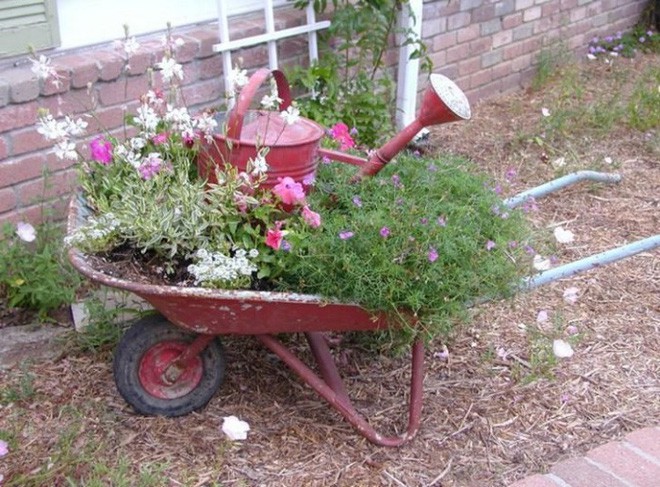 Bạn cũng có thể sử dụng một chiếc xe đẩy cát cỡ nhỏ để trồng hoa. Một chiếc bình tưới cây cùng màu với xe đẩy cát sẽ là vật dụng trang trí thú vị để khoảng sân vườn nhỏ của bạn trở nên ấn tượng hơn.