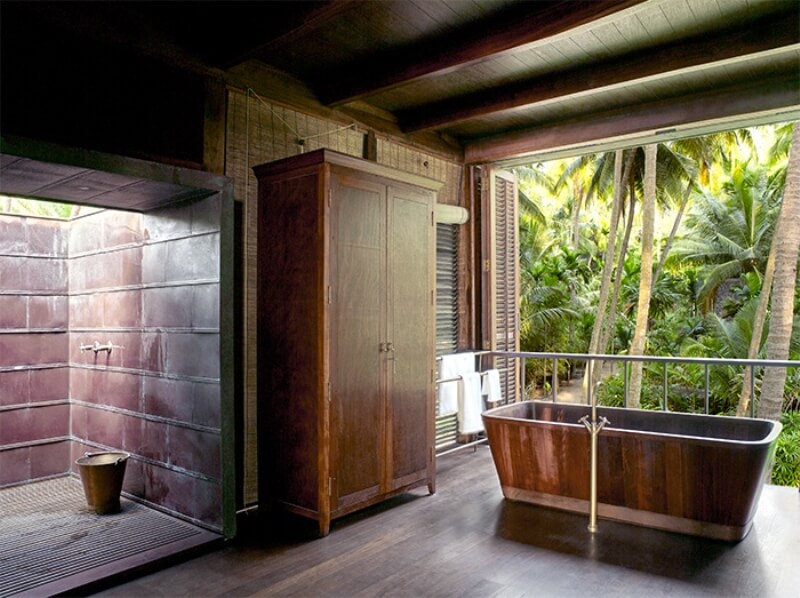Phòng tắm này có tầm nhìn đẹp ra vườn dừa. Nền phòng tắm lát đá phối hợp với tường ốp gỗ tạo nét duyên dáng hài hòa cho khung cảnh thơ mộng của phòng tắm.