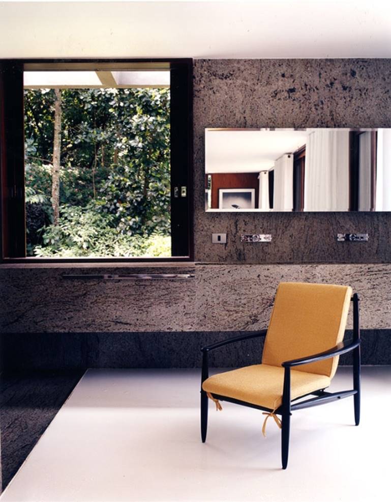 Là một phần trong ngôi nhà nằm ven bìa rừng Brazil, phòng tắm này được lát đá cẩm thạch từ vùng Minas Gerais với khung cửa nhìn ra rừng cây.