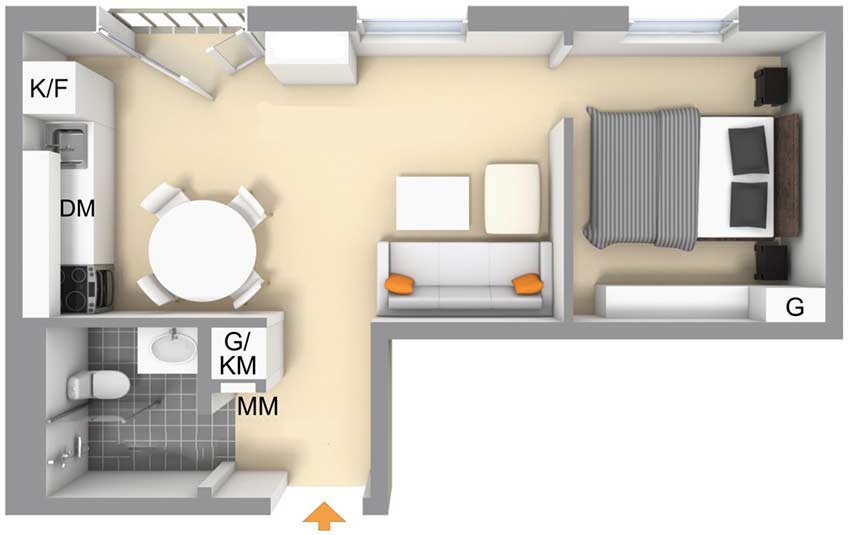 Dù có diện tích khá nhỏ nhưng căn hộ nhỏ xinh này vẫn có đầy đủ các khu vực chức năng gồm: phòng bếp, phòng ngủ riêng tư, khu vực tiếp khách và nhà vệ sinh.