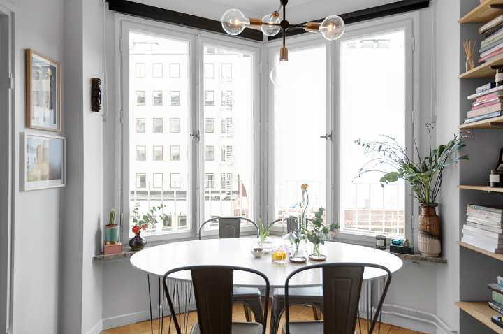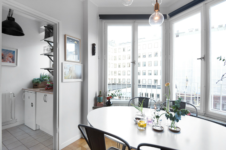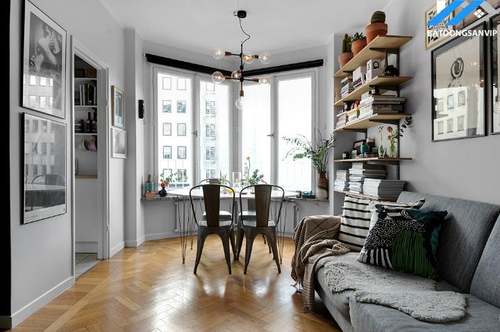 khách, góc bếp và góc ăn uống thoáng sáng đặt cạnh cửa sổ.