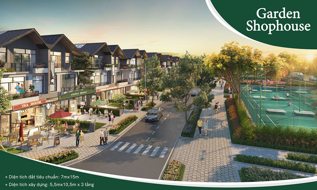 Garden Shophouse – các căn Shophouse vườn với ý tưởng khác biệt, là khái niệm mới mẻ lần đầu tiên được giới thiệu trên thị trường. Mặt tiền các căn hướng đường song hành và khu thể thao phức hợp. Thiết kế các căn đảm bảo một không gian thuận tiện cho việc kinh doanh, bao bọc trong những mảng vườn xanh mát.