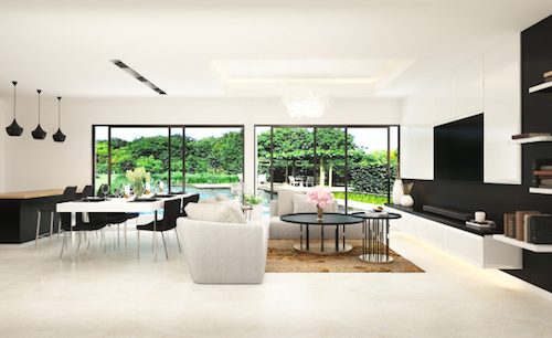 Phòng khách thêm rộng và đẹp nhẹ nhàng nhờ cửa ban công lớn làm bằng kính