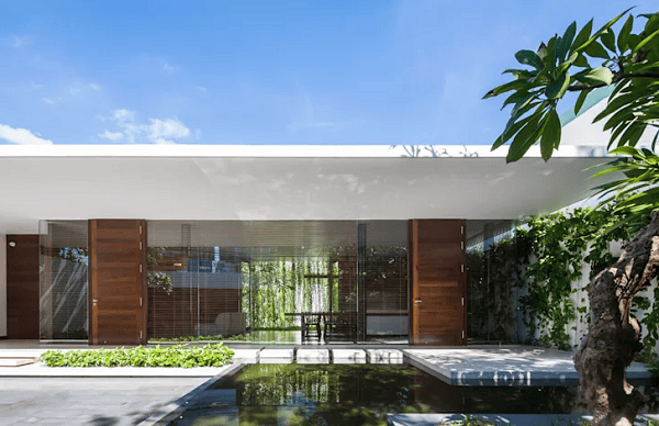 Các căn phòng trong nhà được thiết kế dạng hộc kéo, khi kéo ra để lại các khoảng trống, đó là những hành lang xanh với dây leo kín tường. Các kiến trúc sư đã tối giản số lượng màu sắc sử dụng ở đây bằng cách sử dụng sơn tường màu trắng và vách ngăn là các cột gỗ để làm nổi bật lên khoảng tường xanh mướt mát.